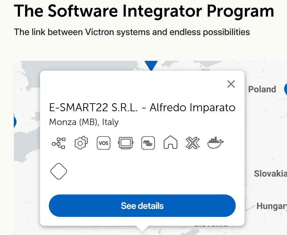 Il Victron Software Integrator è un esperto di integrazione sistemi con conoscenza approfondita dell'ecosistema Victron e competenza nell'uso dei più usati protocolli di comunicazione e nelle piattaforme di domotica/automazione come ad esempio: